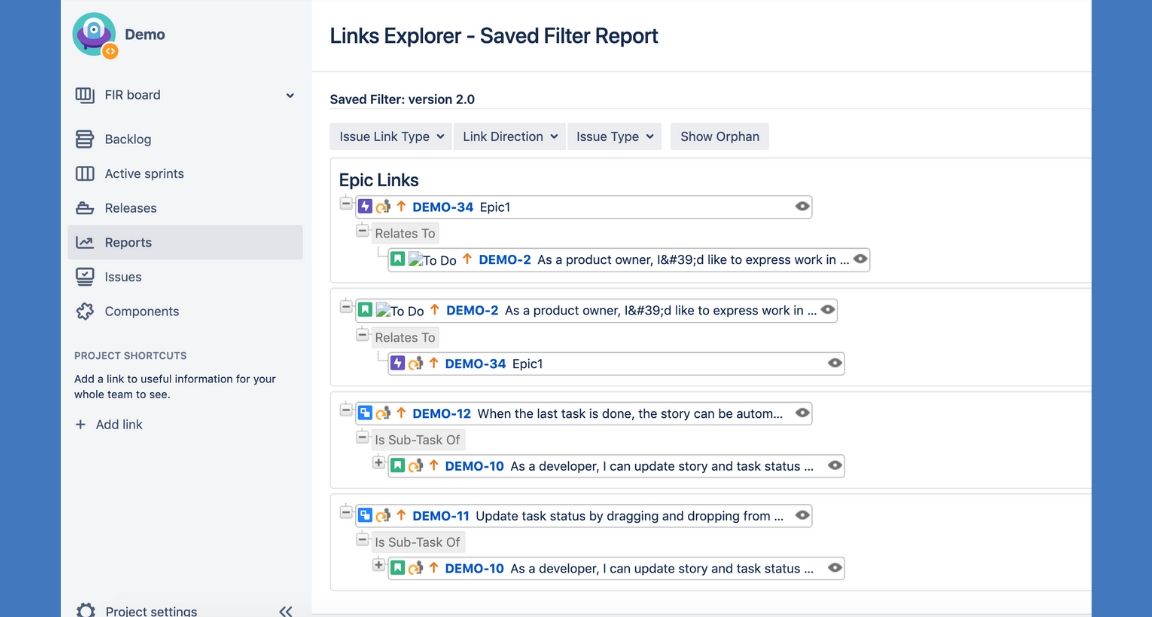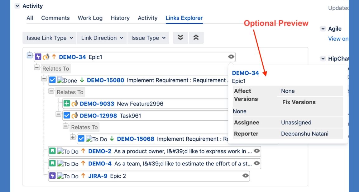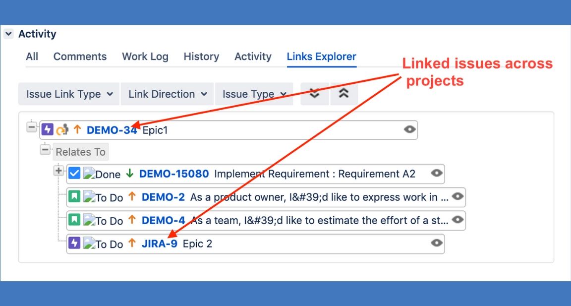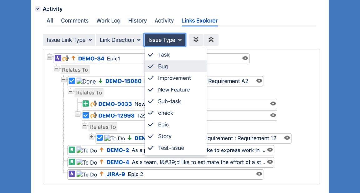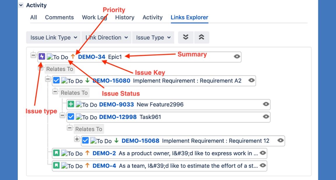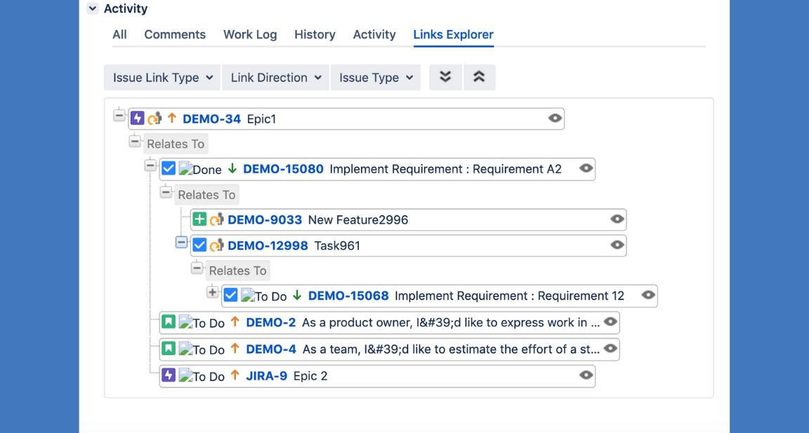 Links Explorer Traceability & Hierarchy is an excellent enhancement over traditional Jira issue links. It allows you to trace, analyze and report the progress of linked JIRA issues, Epics, and Portfolio hierarchies dynamically. This application enables quick navigation of issues and links from a single window and thus greatly enhances the efficiency of users.
