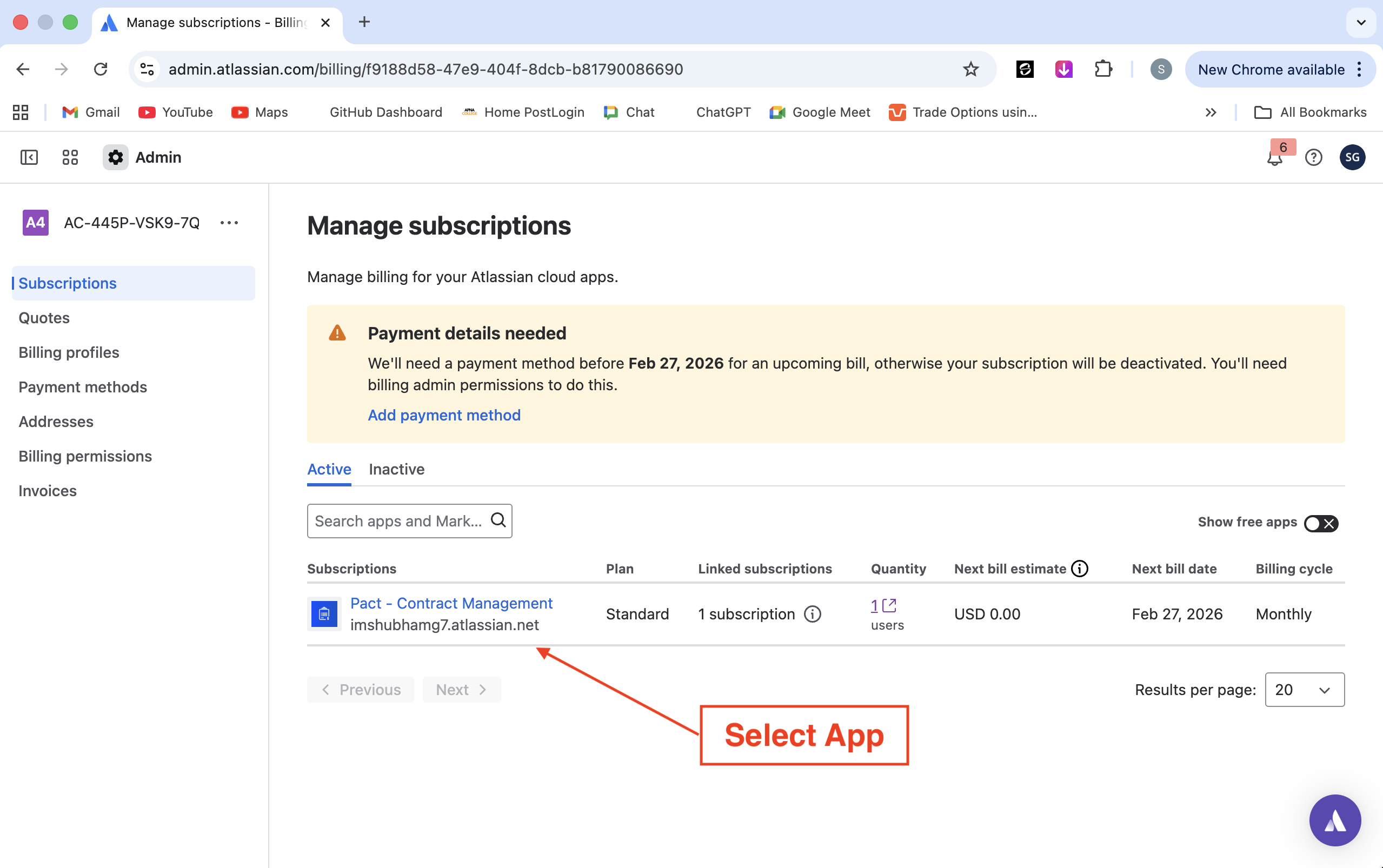 Copy the promo code for the specific app you want to receive a discount on. Next, visit admin.atlassian.com/billing/ , and select the app for which you want to apply the promo code.