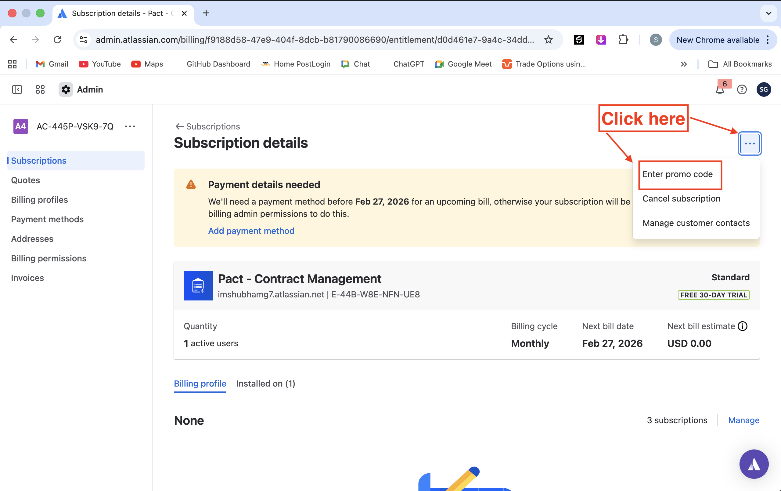 After selecting the app, you’ll land on the Subscription details page. Click the three-dot menu (⋯) and choose Enter promo code from the options.