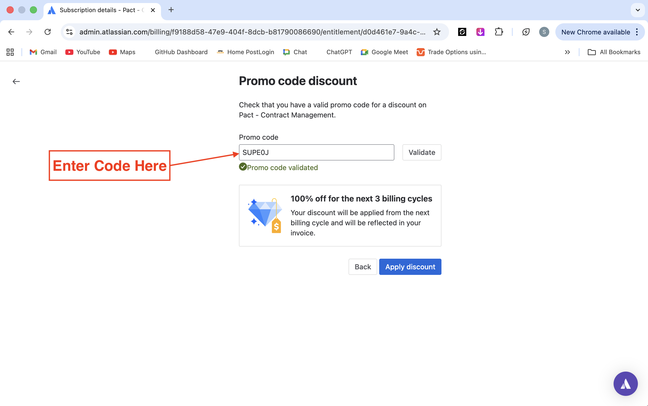 Paste the promo code you copied earlier and click Validate. Once you see “Promo code validated”, click Apply discount to activate it.